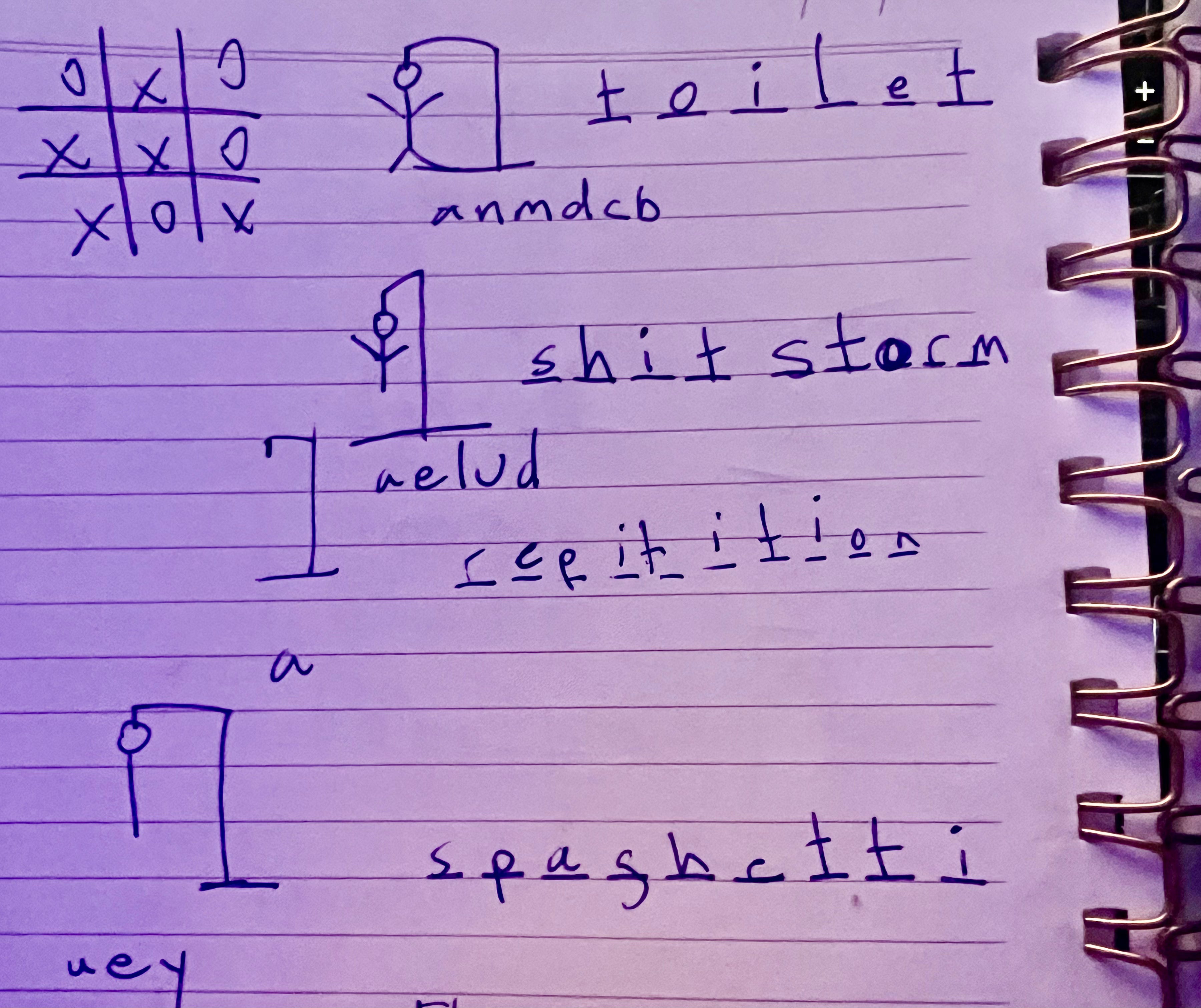 I flipped to the back of my journal and scratched out a linear gallows along with six blank spaces. The word was TOILET. He guessed and lost.