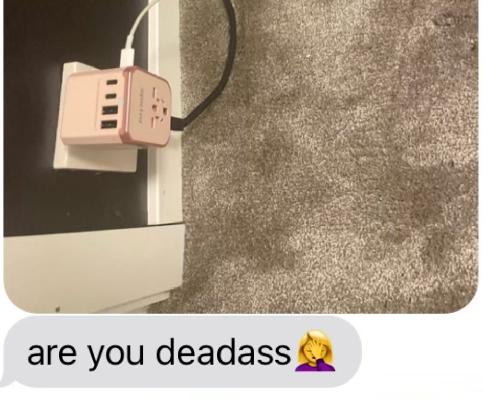 She sent him a pic of the adapter with the text “are you deadass.” I interpreted this to mean “you have committed a punishable offense and as a consequence your mother is going to strangle you,” which was not too far from the truth.