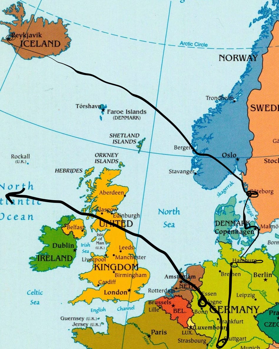 My journey from California to Germany has progressed as such: car→ airplane→ bus→ Iceland → bus → airplane → car → ferry → Sweden → golf cart → ferry → car → ship → Germany → rental car → Hamburg → train → Stuttgart → train → Trier → train → HERE.